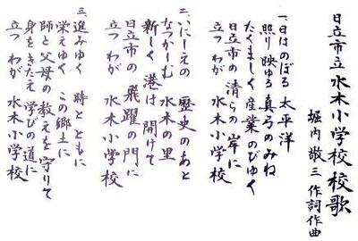 私(川上)は水木小の児童にぜひとも「水」のように四方八方に、のびのびと飛躍発展する人間になってほしい、そして、この「水」のように我々が生きてゆく社会にとってなくてはならぬ人間、大いなる貢献のできる人間に育ててゆきたい。
