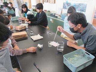 実験方法の説明をよく聞き、水溶液の取り扱いに気を付けながら実験を進めました。