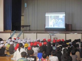 また、体育館に避難・集合後は、防犯サポーターの方のお話を聞いたり、DVDを視聴したりして、「いざというときにどんな行動をとればいいのか」についてのポイントを学びました。避難の様子がスムーズであったと、防犯サポーターの方からお褒めの言葉もいただきました。