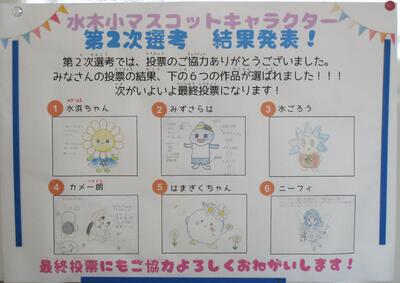 以前、紹介しましたように、運営委員会のプロジェクト Team が、学校のマスコットキャラクターを作る計画を進めてくれています。児童たちからは、73点も個性あふれるキャラクターの応募がありました。1次選考で11点に、2次選考で下の通りさらに6点に絞られています。
