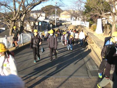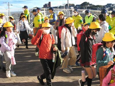 (水木地区コミュニティ推進協議会の皆さまに見守られて一斉下校)