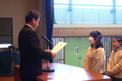 (始業式に先立ち、水木小キャラクター製作の賞状を授与)