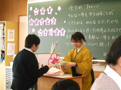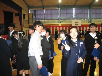 退場後は教室に戻り、一人一人に花を手渡したり、各担任からのメッセージ等がありました🤣 そして、式場に戻り、担任の先生への花束・色紙等を贈り、記念撮影です。