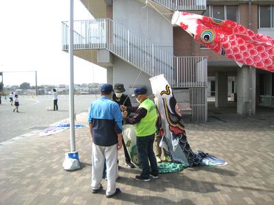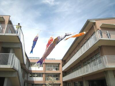 今日の2校時、水木コミュニティー推進会の方々が訪れ、鯉のぼりを飾っていただきました。昨年度もお世話になっておりますが、今年度は、ハマギクホールにも飾っていただき、校舎内・外がとても華やかになりました・・・🤩