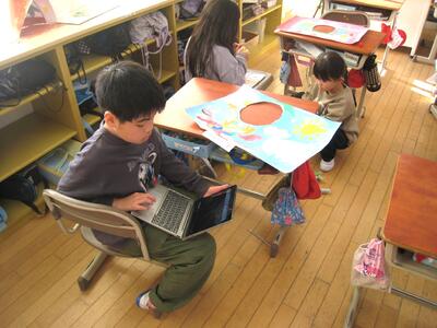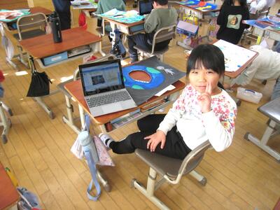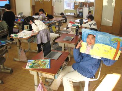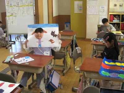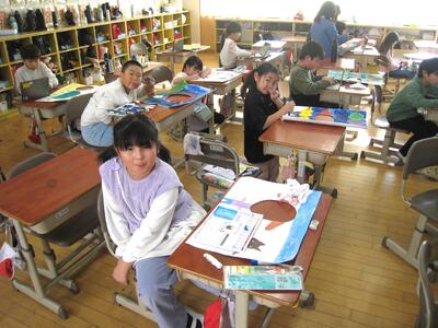 3-1の図工の授業「顔を出したら なんだかワクワク」で、思わず顔を出したくなるパネル作りに取り組んでいました。