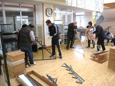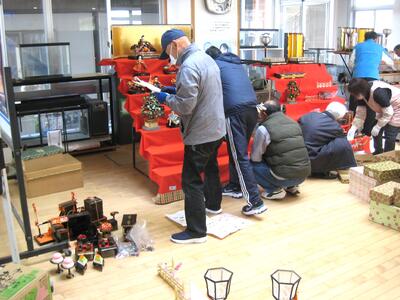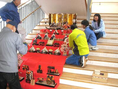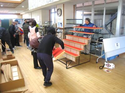 今日の午前中、水木交流センターの職員及び地域の方々が訪れ、雛人形飾りを設置してくれました。地域の方々のご厚意で、ご自宅にある七段雛人形飾りを4セットお借りしました。作業途中に子供たちも集まってきて、嬉しく眺めている様子がとても印象的でした。